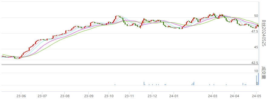 今日(周二)盤面多數(shù)收綠,現(xiàn)貨月240525生絲合約今日增倉,價格有所收跌。同樣,活躍月份240925和250325生絲合約今日也有所增倉收綠。