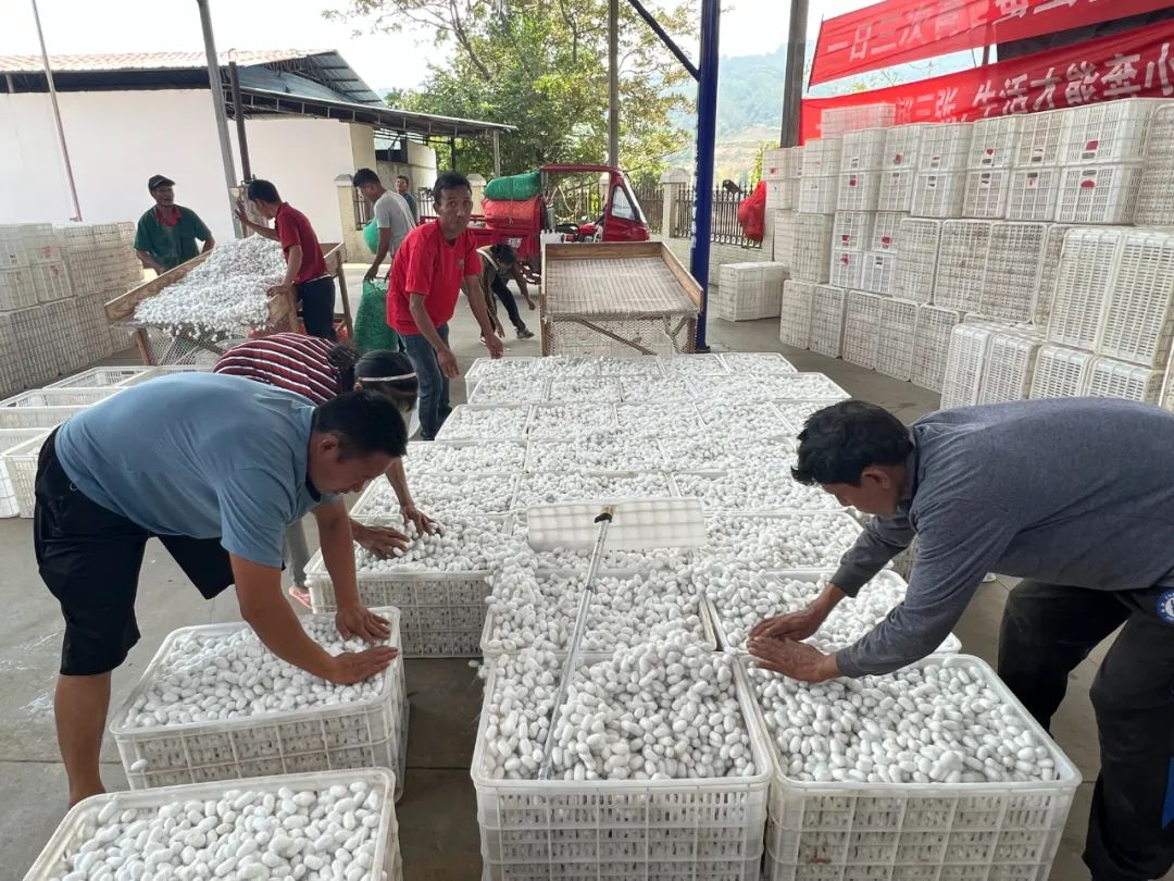 在云南隴川,當?shù)氐牡诙豪O正在上市。多年來,德宏正信實業(yè)股份有限公司從種桑、養(yǎng)蠶到蠶繭收購各環(huán)節(jié)與農(nóng)戶建立緊密的利益聯(lián)結(jié)機制,采取“龍頭企業(yè)+專業(yè)化小蠶共育基地+農(nóng)戶”的生產(chǎn)組織模式和“科技特派員+公司技術(shù)人員+農(nóng)村經(jīng)濟合作組織+科技示范戶+輻射帶動戶”的科技示范推廣模式,把養(yǎng)蠶環(huán)節(jié)中技術(shù)要求高、養(yǎng)殖難度大的工作由企業(yè)承擔,讓蠶農(nóng)輕松養(yǎng)蠶、放心養(yǎng)蠶,還不斷延伸產(chǎn)業(yè)鏈條,切實帶動當?shù)禺a(chǎn)業(yè)發(fā)展。