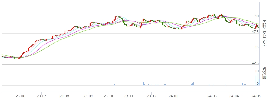 今日(2024年05月08日,周三)中國(guó)繭絲綢交易市場(chǎng)生絲指數(shù)下跌0.14%報(bào)于4892.52點(diǎn)。B絲(商檢4A級(jí)生絲):240525合約下跌0.12萬(wàn)元報(bào)收于48.45萬(wàn)元;240925合約下跌0.12萬(wàn)元報(bào)收于48.99萬(wàn)元;250325合約下跌0.12萬(wàn)元報(bào)收于49.17萬(wàn)元。