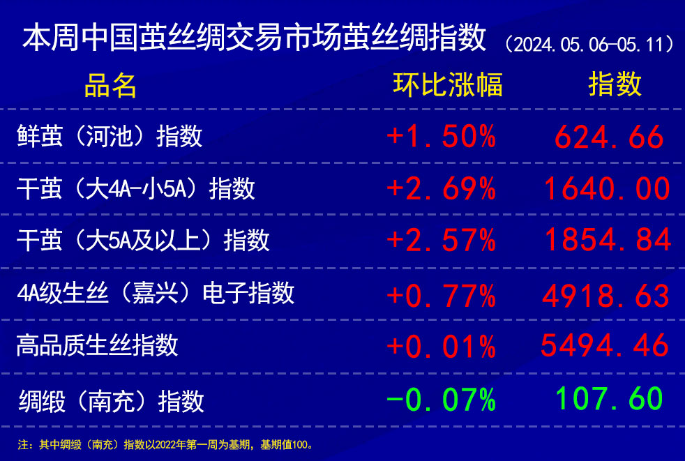 上周時(shí)間段多為五一假期,也是為廣西宜州等地的第二批春繭上市時(shí)間段,本周協(xié)作單位所報(bào)的鮮繭價(jià)格等指教等也包括了上周。整體上,收購(gòu)價(jià)格持高,同時(shí)五一后廣西等地大范圍降雨,一定程度上影響鮮繭指標(biāo)。根據(jù)協(xié)作單位所報(bào)轉(zhuǎn)換后,鮮繭指數(shù)上漲1.5%報(bào)于624.66點(diǎn)。