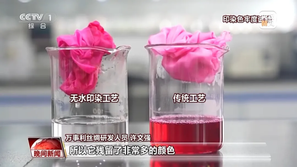 萬事利絲綢研發(fā)人員許文強(qiáng)介紹,傳統(tǒng)面料跟纖維的結(jié)合能力較差,所以顏色殘留多。通過免水洗新技術(shù)處理過的面料,可以看到它的杯底基本沒有顏色,相當(dāng)于活性染料和面料纖維已經(jīng)達(dá)到100%的結(jié)合。