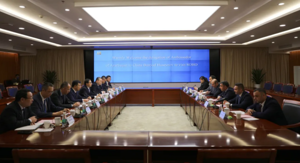 周勇對胡賽諾夫大使一行的來訪表示歡迎,并介紹了蘇豪控股集團(tuán)的基本情況以及與阿塞拜疆的交流合作情況。他表示,阿塞拜疆是連接歐亞的橋梁,資源豐富、區(qū)位優(yōu)越。江蘇與阿塞拜疆經(jīng)貿(mào)合作交往密切,貿(mào)易總量逐年大幅提升。蘇豪控股集團(tuán)高度重視阿塞拜疆市場拓展,不斷擴大設(shè)備出口規(guī)模,增強桑蠶絲綢領(lǐng)域業(yè)務(wù)對接和技術(shù)合作,雙方貿(mào)易往來更加頻繁,交流合作成果豐碩??缋锖H運輸走廊建設(shè)取得重要進(jìn)展,今年2月成功開行南京至阿塞拜疆首都巴庫的跨里海班列,進(jìn)一步豐富了江蘇班列多元通道發(fā)展的布局,加強了江蘇與阿塞拜疆的互聯(lián)互通。展望未來,雙方合作空間廣闊,前景令人期待,油氣產(chǎn)業(yè)是阿塞拜疆的重要支柱產(chǎn)業(yè),與蘇豪控股集團(tuán)大力發(fā)展的大宗商品及能源業(yè)務(wù)高度契合,希望雙方加強原油進(jìn)口方面的業(yè)務(wù)交流,探索務(wù)實合作的可行路徑。
