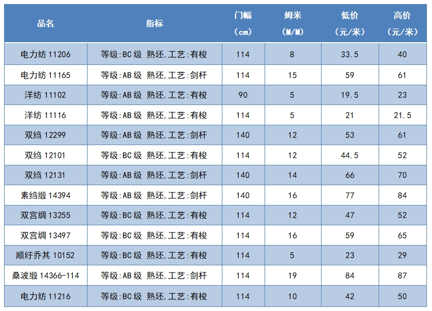 本周綢緞指數(shù)協(xié)作單位成交價(jià)格區(qū)間