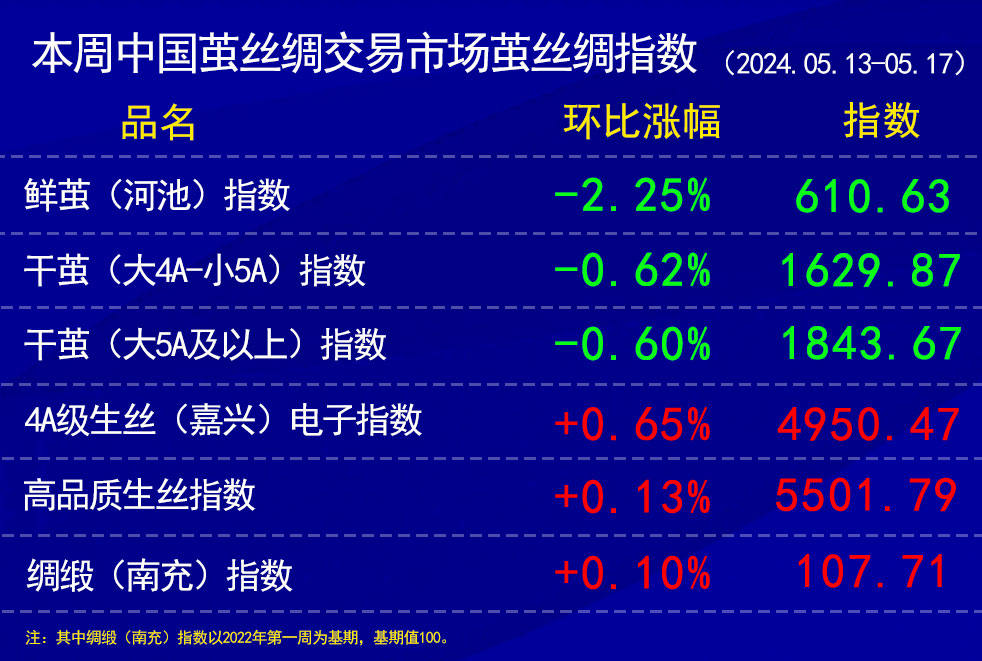 高品質(zhì)生絲指數(shù)上,本周協(xié)作單位走貨情況一般,部分工廠反映織造企業(yè)拿貨積極性一般,同時(shí)出貨積極性也一般。價(jià)格仍持穩(wěn)波動(dòng)。本周高品質(zhì)生絲指數(shù)微漲0.13%報(bào)收于5501.79點(diǎn)。