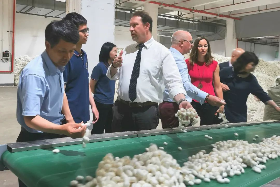在參觀過(guò)程中,國(guó)際絲綢聯(lián)盟秘書處和愛馬仕紡織控股的來(lái)賓與企業(yè)就工廠化養(yǎng)蠶的變革發(fā)展及與傳統(tǒng)養(yǎng)蠶的區(qū)別,進(jìn)行了深入且細(xì)致的交流。來(lái)賓紛紛驚嘆工廠化養(yǎng)蠶的突破性革命,表示工廠化養(yǎng)蠶帶來(lái)顛覆性印象,夸贊道:人工飼料工廠化養(yǎng)蠶和喬布斯造蘋果手機(jī)一樣了不起。