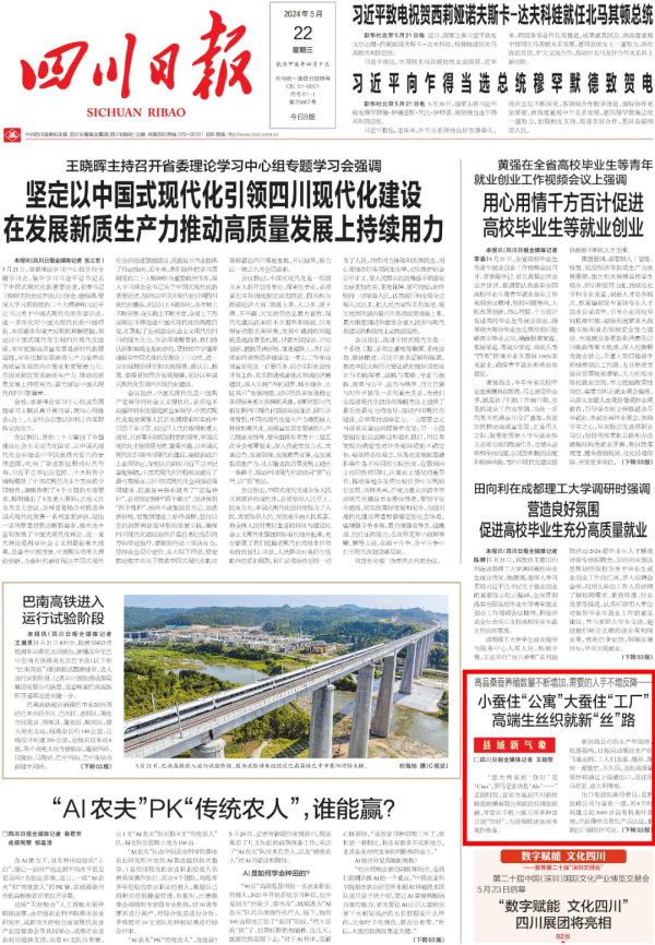 5月22日,《四川日報》在頭版“縣域新氣象”欄目中,以《高縣桑蠶養(yǎng)殖數(shù)量不斷增加,需要的人手不增反降——小蠶住“公寓” 大蠶住“工廠” 高端生絲織就新“絲”路》為題,從蠶農(nóng)栽桑養(yǎng)蠶、小蠶共育技術推廣、繭絲生產(chǎn)企業(yè)加大科技投入等方面全面報道了高縣蠶桑產(chǎn)業(yè)高質量發(fā)展成效。