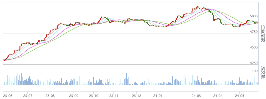 今日(周二)盤面各遠近生絲合約價格繼續(xù)小幅波動,成交量一般,整體繼續(xù)小幅增倉。240925生絲合約上,各中短均線似有逐步交匯之意,KDJ指標在40處逐步向上交匯,價格反復拉鋸震蕩。