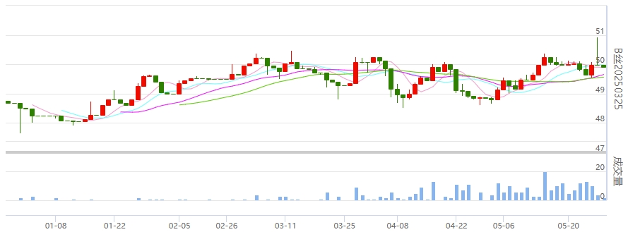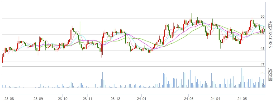 今日(2024年05月28日,周二)中國繭絲綢交易市場生絲指數(shù)持平報于4926.75點。B絲(商檢4A級生絲):240625合約報平收于48.84萬元;240925合約下跌0.09萬元報收于49.26萬元;250325合約下跌0.06萬元報收于49.92萬元。