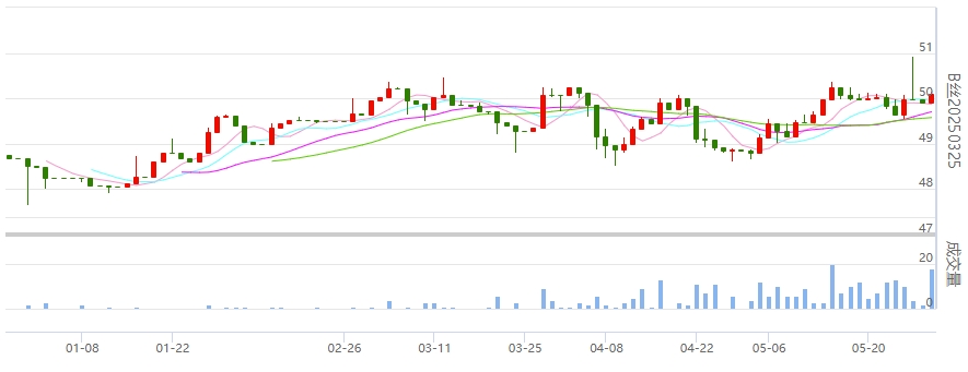 今日(2024年05月29日,周三)中國繭絲綢交易市場生絲指數(shù)上漲0.48%報于4950.46點。B絲(商檢4A級生絲):240625合約上漲0.27萬元報收于49.11萬元;240925合約上漲0.21萬元報收于49.47萬元;250325合約上漲0.18萬元報收于50.10萬元。
