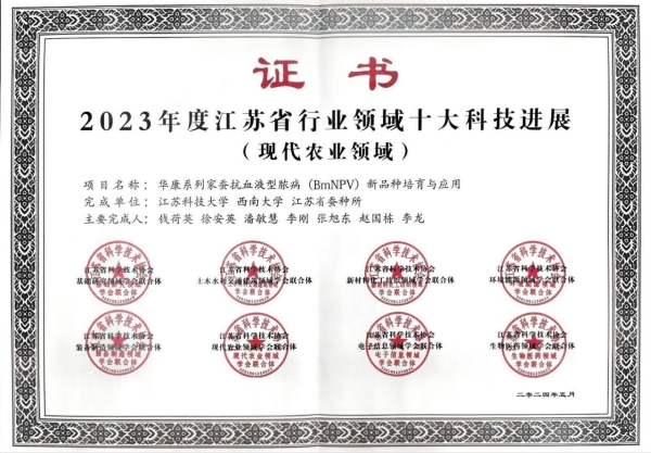 近日,江蘇省8個(gè)學(xué)會(huì)聯(lián)合體共同發(fā)布2023年度江蘇省行業(yè)領(lǐng)域十大科技進(jìn)展,江蘇科技大學(xué)聯(lián)合西南大學(xué)、江蘇省蠶種所研發(fā)的“華康系列家蠶抗血液型膿?。˙mNPV)新品種培育與應(yīng)用”成功入選(現(xiàn)代農(nóng)業(yè)領(lǐng)域)。本次評(píng)選涵蓋基礎(chǔ)研究、環(huán)境能源、電子信息、裝備制造、新材料化工紡織、土木水利交通建筑、生物醫(yī)藥、現(xiàn)代農(nóng)業(yè)等八大領(lǐng)域,旨在全面展示江蘇省在科技領(lǐng)域的最新成果和進(jìn)步,激發(fā)廣大科技工作者的創(chuàng)新活力。經(jīng)提名、形式審查、初評(píng)、綜合評(píng)審并向社會(huì)公示,遴選出具備高度創(chuàng)新性和應(yīng)用價(jià)值、代表江蘇省科技創(chuàng)新高水平的科技成果62項(xiàng)。