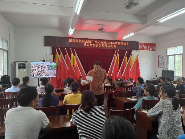 5月30日,劉吉平來到馬山縣古寨瑤族鄉(xiāng)民興村和民樂村,開展種桑養(yǎng)蠶技術(shù)培訓(xùn)講座,解答了考察過程中發(fā)現(xiàn)的問題,并建議蠶戶多使用生石灰和漂白粉進(jìn)行蠶房環(huán)境用具消毒管理。