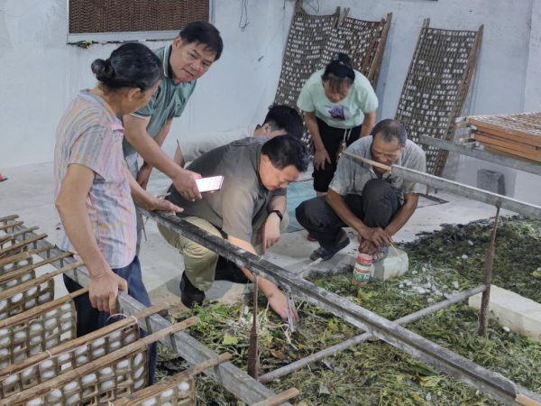 有二十多年養(yǎng)蠶經(jīng)驗的蠶農(nóng)韋大姐表示,今年上半年頻繁的陰雨天氣導(dǎo)致桑園病蟲害增加,桑葉數(shù)量減少、質(zhì)量下降,蠶寶寶出現(xiàn)僵病和膿病的數(shù)量急劇增加,蠶繭質(zhì)量也因此大打折扣。面對大面積的蠶病,即便是經(jīng)驗豐富的她也感到束手無策。劉吉平遂從蠶房的通風(fēng),干燥,降溫,消毒等各個方面對蠶戶的問題進(jìn)行細(xì)致解答,并講解常見蠶病應(yīng)當(dāng)采用的蠶藥及防治措施。