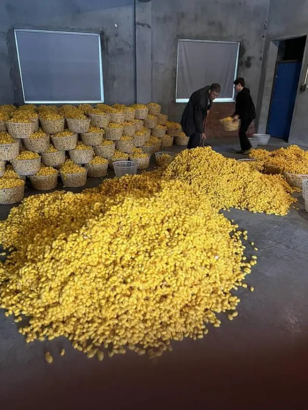 “黃金繭”,繭如其名,蠶寶寶吐出來的蠶絲是金黃色的,猶如一根根金絲線,結(jié)出來的繭子,一個(gè)個(gè)色澤亮麗。