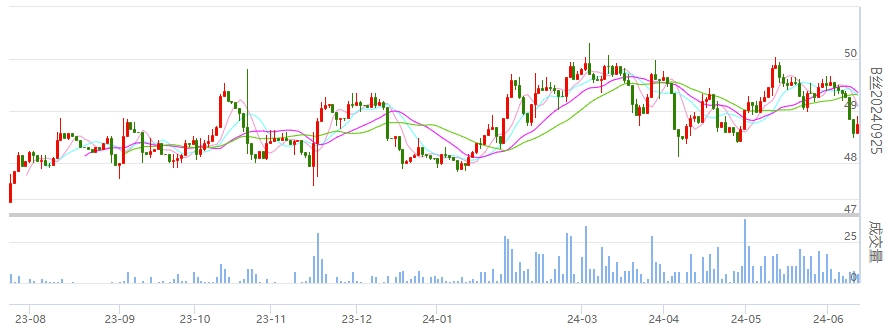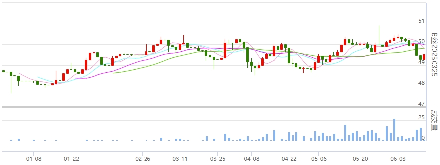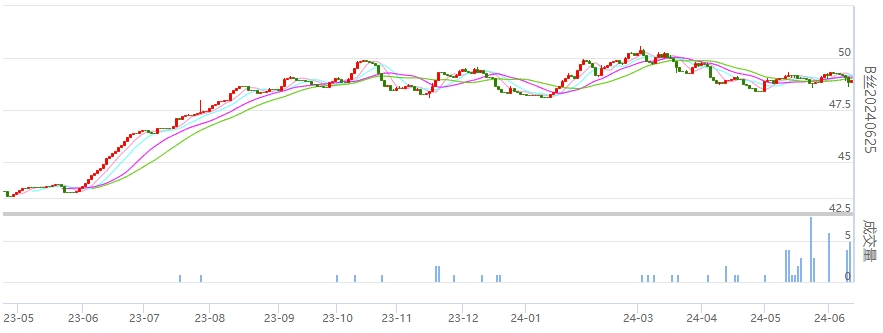 今日(2024年06月13日,周四)中國繭絲綢交易市場生絲電子指數(shù)上漲0.15%報(bào)于4905.48點(diǎn)。B絲(商檢4A級生絲):240625合約上漲0.09萬元報(bào)收于48.96萬元;240925合約上漲0.18萬元報(bào)收于48.75萬元;250325合約上漲0.24萬元報(bào)收于49.53萬元。