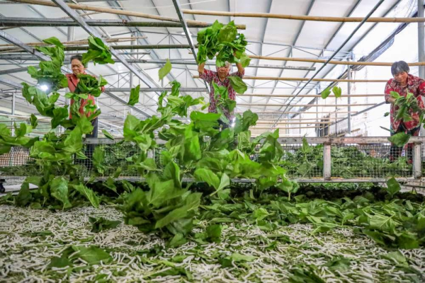 “蠶繭和僵蠶經(jīng)濟(jì)價(jià)值高,養(yǎng)蠶最大的好處是,能快速增加農(nóng)民的收入?!眳羌t云是蠶桑養(yǎng)殖專家,她介紹,近年來(lái),為了激活當(dāng)?shù)貍鹘y(tǒng)蠶桑產(chǎn)業(yè)的優(yōu)勢(shì),會(huì)龍鎮(zhèn)注重科學(xué)技術(shù)引進(jìn)和養(yǎng)蠶設(shè)備更新。一批見(jiàn)效快、適應(yīng)性強(qiáng)的蠶桑養(yǎng)殖技術(shù),如成片桑樹(shù)病蟲(chóng)害防治、小蠶共育、大蠶省力化飼養(yǎng)等“送課上門”,加之智能化軌道給桑設(shè)備、小蠶共育智慧系統(tǒng)的引入,當(dāng)?shù)氐纳7N從原來(lái)長(zhǎng)不高、產(chǎn)量低的711,變?yōu)楝F(xiàn)在葉片大、產(chǎn)量高的強(qiáng)桑1號(hào);養(yǎng)蠶方式從原來(lái)的蠶臺(tái)式變?yōu)楝F(xiàn)在的地場(chǎng)軌道式……傳統(tǒng)蠶桑產(chǎn)業(yè)走上了穩(wěn)產(chǎn)高產(chǎn)發(fā)展道路,為企業(yè)及蠶農(nóng)增收致富打下堅(jiān)實(shí)基礎(chǔ)。