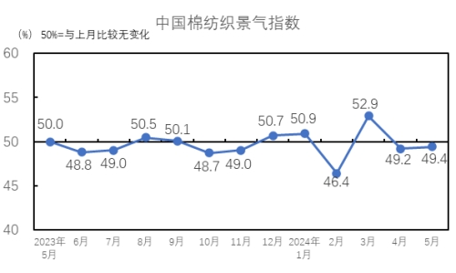 由于今年“金三銀四”旺季未能兌現(xiàn),過早進入淡季,2024年5月,生產(chǎn)指數(shù)為50.2%,高于臨界點,較4月上升0.8個百分點。根據(jù)國家統(tǒng)計局數(shù)據(jù),1-5月紗產(chǎn)量累計同比下降1.28%,降幅較1-4月收窄0.83個百分點,5月紗線生產(chǎn)情況稍有好轉;1-5月布產(chǎn)量累計同比上升2.48%,增幅較1-4月下降0.91個百分點,5月布生產(chǎn)情況下降。從分項指數(shù)看,棉紡織廠設備開臺率指數(shù)為50.1%,較4月下降0.3個百分點。紗產(chǎn)量指數(shù)為50.9%,高于臨界點,較4月上升2.5個百分點;布產(chǎn)量指數(shù)為49.5%,低于臨界點,較4月上升1.1個百分點。