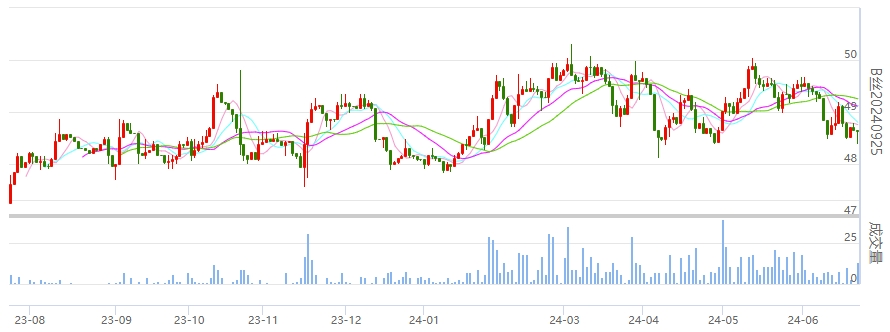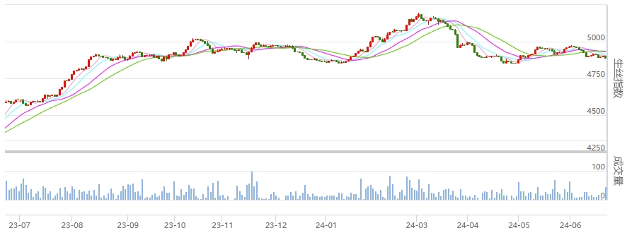 今日(2024年06月24日,周一)中國繭絲綢交易市場生絲電子指數(shù)下跌0.21%報于4891.17點。B絲(商檢4A級生絲):240625合約報平收于49.17萬元;240925合約下跌0.03萬元報收于48.63萬元;250325合約下跌0.24萬元報收于49.08萬元。