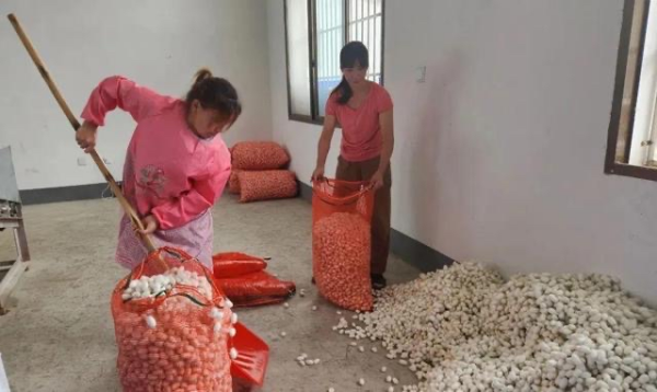 農(nóng)戶(hù)正在將蠶繭裝袋
