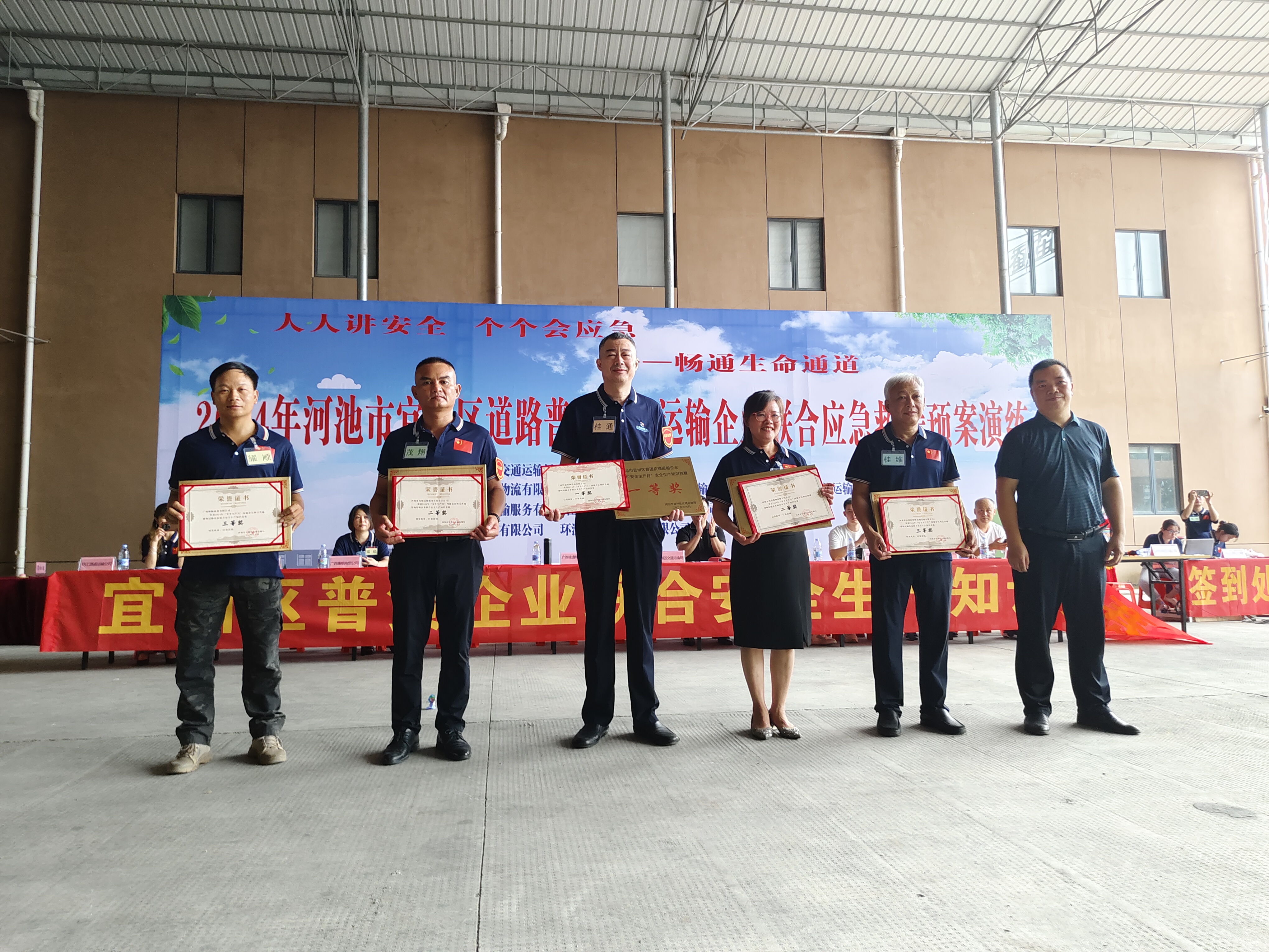 本次演練活動(dòng)貫徹了“安全第一,預(yù)防為主,綜合治理”的安全生產(chǎn)方針和“人人講安全,個(gè)個(gè)會(huì)應(yīng)急”的主題。經(jīng)由全體參演人員全力以赴,全力配合,迅速、有序的實(shí)施了生產(chǎn)安全事故應(yīng)急救援行動(dòng),最終圓滿完成此次演習(xí)。演習(xí)后還進(jìn)行了安全生產(chǎn)知識(shí)競(jìng)賽,最終廣西桂通絲綢物流有限公司獲得安全生產(chǎn)知識(shí)競(jìng)賽一等獎(jiǎng),河池市宜州區(qū)桂維貨物運(yùn)輸有限公司、河池市鴻程貨物運(yùn)輸有限公司、河池市茂翔運(yùn)輸服務(wù)有限責(zé)任公司、廣西耀順商貿(mào)有限公司等分獲二、三等獎(jiǎng)。現(xiàn)場(chǎng)觀賽人員也積極參加了現(xiàn)場(chǎng)的互動(dòng)搶答題環(huán)節(jié)。
