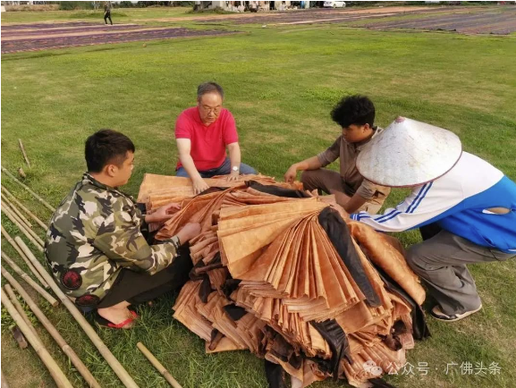 據(jù)介紹,香云紗制作需涉及到13項純手工操作,以“曬莨”一環(huán)最為關(guān)鍵,也最為辛苦。在環(huán)節(jié)中,把過了薯莨汁的香云紗運到曬莨場,然后把香云紗平鋪在草地上,還要用竹竿把布料壓住,防止被風刮走。經(jīng)過晾曬之后,工人要把布料收回去,等待第二天再過薯莨汁,如此重復幾十次,一般前后需要歷經(jīng)2-3個月。但如果降雨頻繁天氣,時間要更長。