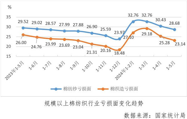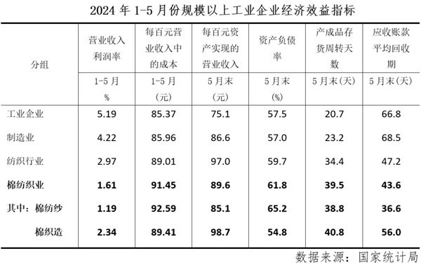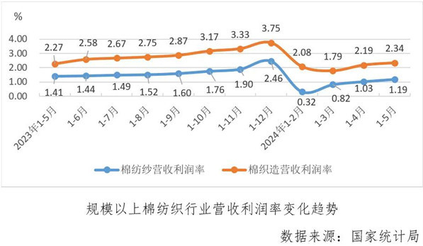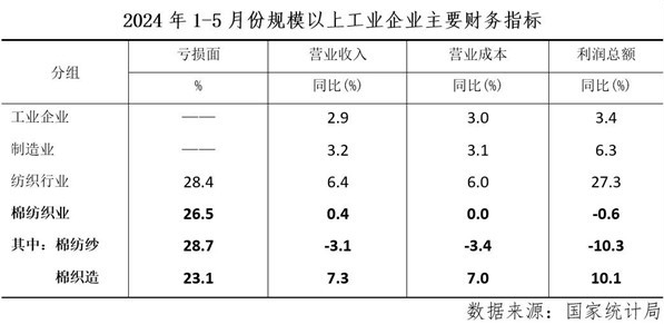 1-5月份數(shù)據(jù)顯示,規(guī)上棉紡織業(yè)雖然營收和利潤(rùn)增速較1-4月份繼續(xù)放緩,但虧損面在降低,利潤(rùn)率也有所回升,主要經(jīng)濟(jì)指標(biāo)漲跌互現(xiàn),效益指標(biāo)局部改善。