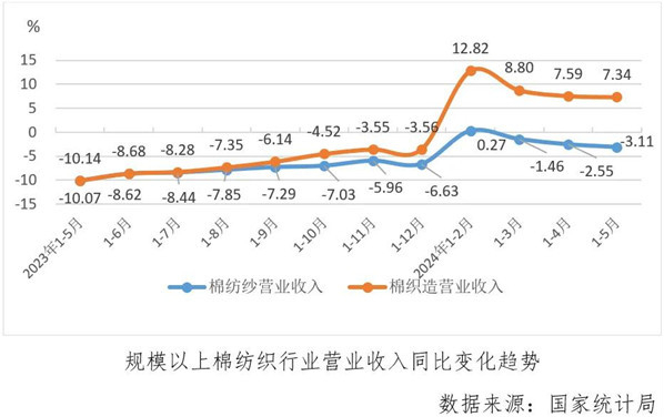 據(jù)國家統(tǒng)計(jì)局?jǐn)?shù)據(jù),1-5月份,規(guī)上棉紡紗營業(yè)收入同比下降3.11%,降幅比1-4月份擴(kuò)大0.56個(gè)百分點(diǎn),規(guī)上棉織造營業(yè)收入同比增加7.34%,增速比1-4月份放緩0.25個(gè)百分點(diǎn)。1-5月份,棉紡紗和棉織造營業(yè)收入指標(biāo)繼續(xù)受阻,且棉紡紗營收累計(jì)增速已連續(xù)三個(gè)月為負(fù)值。
