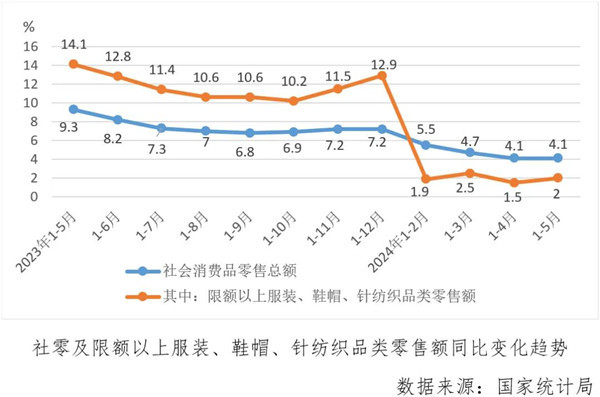 5月份,社會(huì)消費(fèi)品零售總額39211億元,同比增長(zhǎng)3.7%,1-5月份,社會(huì)消費(fèi)品零售總額195237億元,同比增長(zhǎng)4.1%。其中限額以上服裝、鞋帽、針紡織品類5月份和1-5月份累計(jì)同比分別上漲4.4%和2%。