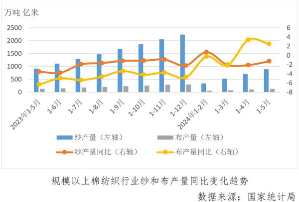 據(jù)國家統(tǒng)計(jì)局?jǐn)?shù)據(jù),1-5月份,規(guī)上紗產(chǎn)量為891.8萬噸,同比下降1.28%,降幅比1-4月份收窄0.83個(gè)百分點(diǎn),規(guī)上布產(chǎn)量為129.9億米,同比增長(zhǎng)2.48%,較1-4月份增幅收窄0.91個(gè)百分點(diǎn)。
