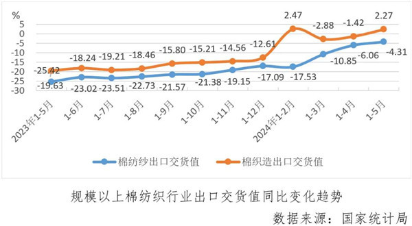 1-5月份,規(guī)上棉紡織業(yè)營業(yè)收入同比增長(zhǎng)0.4%,增速比1-4月份放緩0.4個(gè)百分點(diǎn),利潤(rùn)總額同比下降0.6%,較1-4月份由正轉(zhuǎn)負(fù)。
