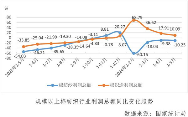 據(jù)國家統(tǒng)計(jì)局?jǐn)?shù)據(jù),1-5月份,規(guī)上棉紡紗利潤(rùn)同比下降10.25%,比1-4月份降幅擴(kuò)大0.87個(gè)百分點(diǎn),棉織造利潤(rùn)同比增長(zhǎng)10.09%,比1-4月份增速放緩7.82個(gè)百分點(diǎn),棉紡紗和棉織造利潤(rùn)同比增速持續(xù)分化。