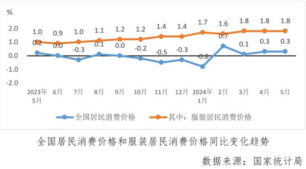 5月份,全國居民消費(fèi)價(jià)格同比上漲0.3%,環(huán)比下降0.1%,其中服裝居民消費(fèi)價(jià)格同比上漲1.8%,環(huán)比上漲0.4%。1-5月平均,全國居民消費(fèi)價(jià)格比上年同期上漲0.1%,其中服裝居民消費(fèi)價(jià)格同比上漲1.7%。