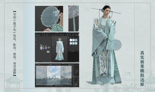 《天青呈露》運用的AIGC和STYLE 3D技術(shù),對應解決的正是文化素材設計和高效能打版問題?!霸谥谱魃希覀兘柚鶤IGC對過去圖樣進行捕捉和輸入,通過輸入《聽琴圖》《十八學士圖》等宋畫的相關元素,根據(jù)設計指令生成古今融合的圖形紋樣?!币﹁〗忉?,企業(yè)從AIGC生成數(shù)字紋樣素材后,STYLE 3D則進行數(shù)字仿真面料和數(shù)字打版,并生成數(shù)字樣衣,用戶可直觀查看紋樣、工藝、面料及款式細節(jié),而設計師也可第一時間根據(jù)需要,在電腦端直接對上述各項進行優(yōu)化調(diào)整,大大提升了效率和效能。
