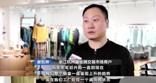 在浙江杭州一家桑蠶絲面料銷售門店,電商主播張睿航表示,現(xiàn)在桑蠶絲面料很受歡迎,直播間一天的銷售額就能達到四萬元。
