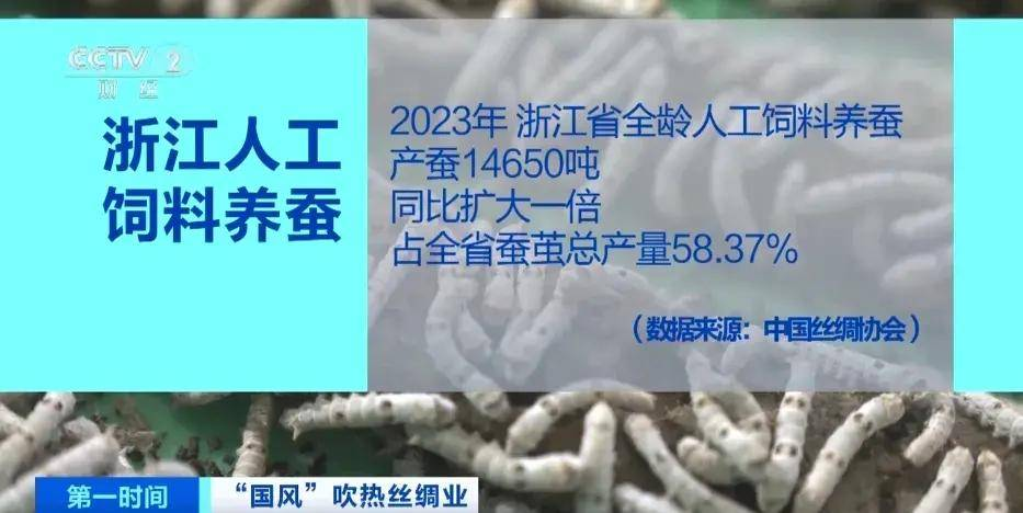 數(shù)據(jù)顯示,2023年,浙江省全齡人工飼料養(yǎng)蠶產(chǎn)蠶14650噸,同比擴大一倍,占全省蠶繭總產(chǎn)量的58.37%。業(yè)內(nèi)人士表示,目前,人工飼料養(yǎng)蠶已初具規(guī)模,隨著技術(shù)不斷進步,未來產(chǎn)量有望進一步提升。