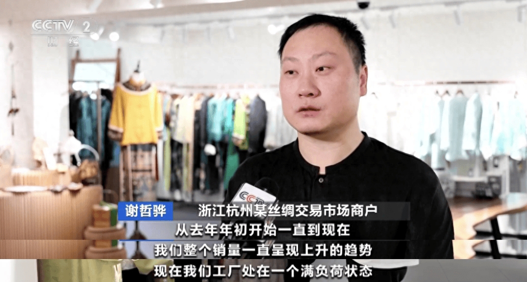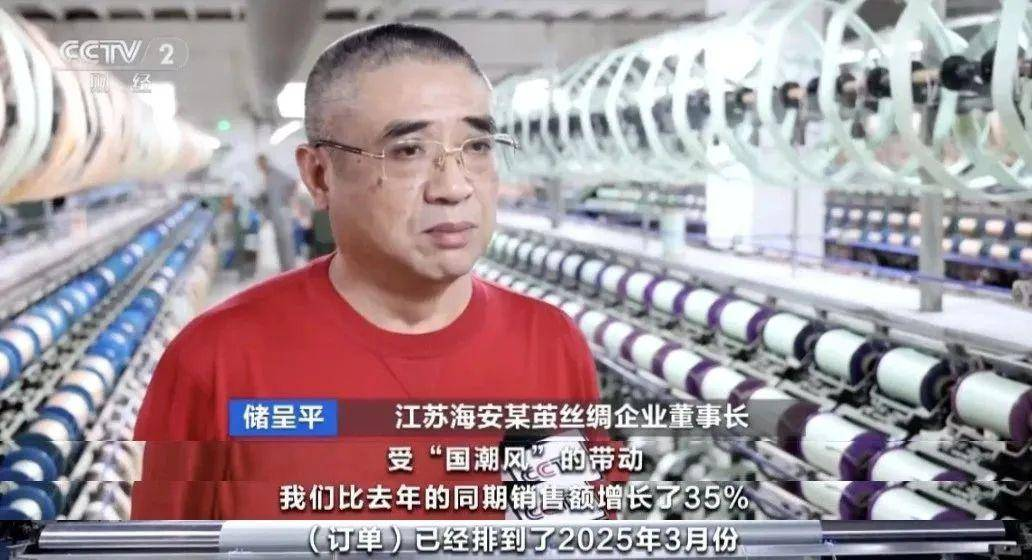 江蘇海安某繭絲綢企業(yè)董事長 儲呈平:受“國潮風”的帶動,我們比去年同期銷售份額增長了35%,訂單已經(jīng)排到了2025年3月份。