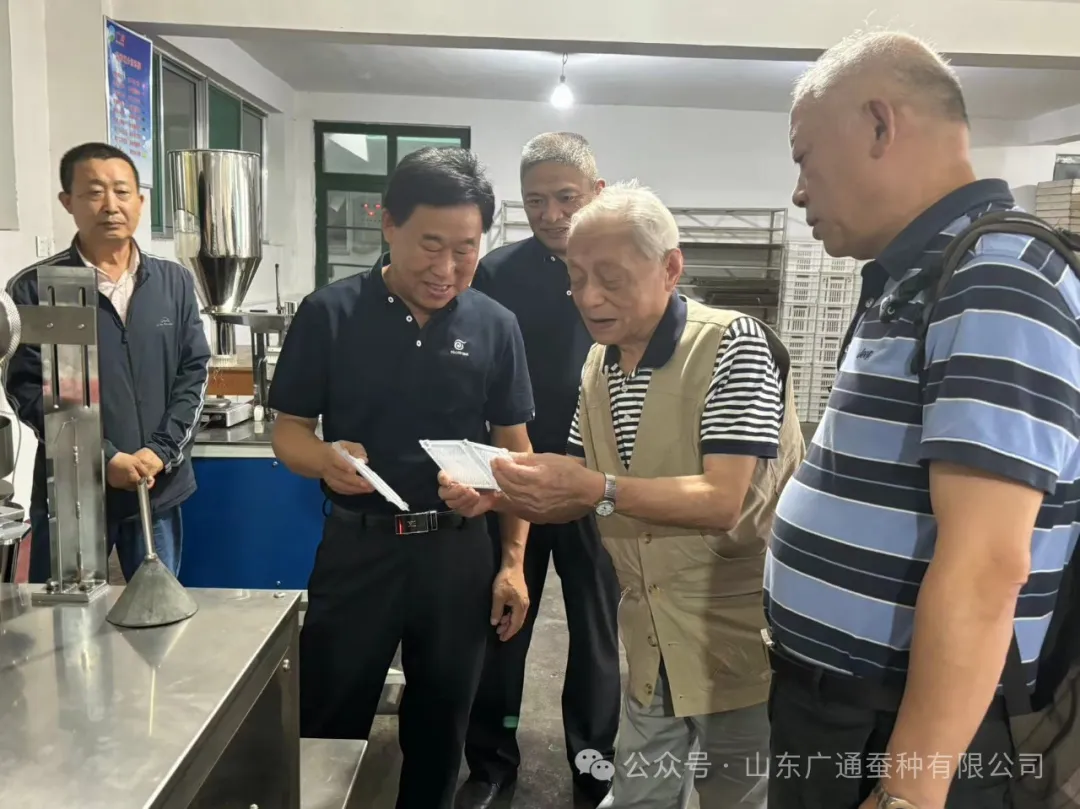 7月8日,時年94歲高齡的浙江大學蠶桑專家馮家新教授到廣通集團傳經送寶,廣通集團連海剛、房德文、閻跟東、黃海業(yè)等有關人員陪同。馮教授一行分別到正在飼育中的人工飼料車間和蠶種冷庫就飼料養(yǎng)蠶、蠶種浸酸、整理、冷藏情況進行參觀指導。通過現場參觀,馮教授對廣通集團近年來在蠶桑產業(yè)中的快速發(fā)展表示了充分的肯定。