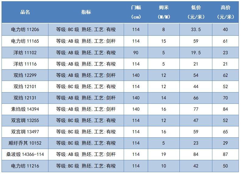 本周綢緞指數(shù)協(xié)作單位成交價(jià)格區(qū)間