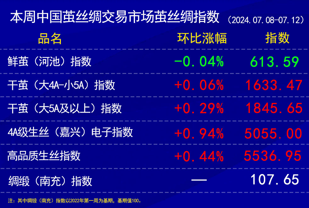 高品質(zhì)生絲指數(shù)上,本周部分協(xié)作單位價(jià)格有所上調(diào),帶動(dòng)指數(shù)上漲0.44%。