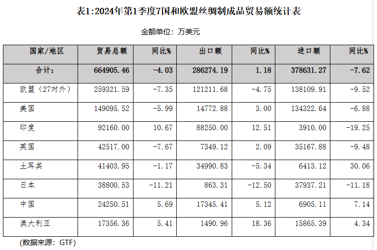 歐盟、美國、印度、土耳其、中國、日本、英國和澳大利亞(以下簡稱“7國和歐盟”)是世界絲綢制成品貿(mào)易最重要的參與者,2024年第1季度貿(mào)易總額為66.49億美元,同比下降4.03%。其中出口額28.63億美元,同比增長1.18%;進口額37.86億美元,同比下降7.62%。(詳見表1)
