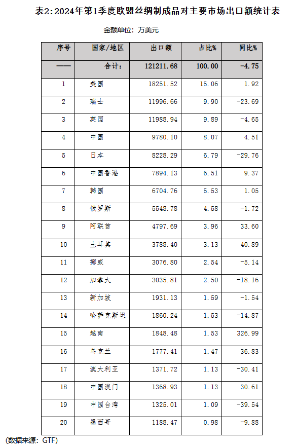 第1季度,歐盟絲綢制成品出口額為12.12億美元,同比下降4.75%。
