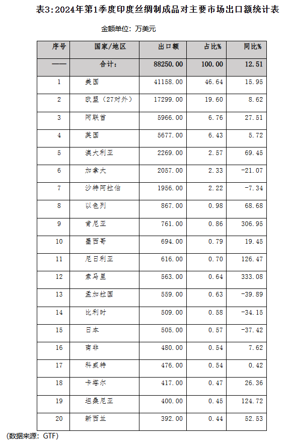 第1季度,印度絲綢制成品出口額為8.83億美元,同比增長12.51%,出口額全球列第二位。對前五位主要出口市場出口額均增長。其中,對第一大市場美國的出口額持續(xù)增長,同比增幅擴大至15.95%;對第三大出口市場阿聯(lián)酋的出口由降轉(zhuǎn)升,且增幅達27.51%;對澳大利亞、以色列、肯尼亞、尼日利亞和索馬里出口激增(詳見表3)。
