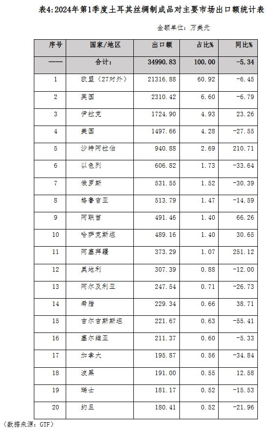 第1季度土耳其絲綢制成品出口額為3.50億美元,同比下降5.34%。對第一大市場歐盟出口額持續(xù)下降,且降幅略有擴大。