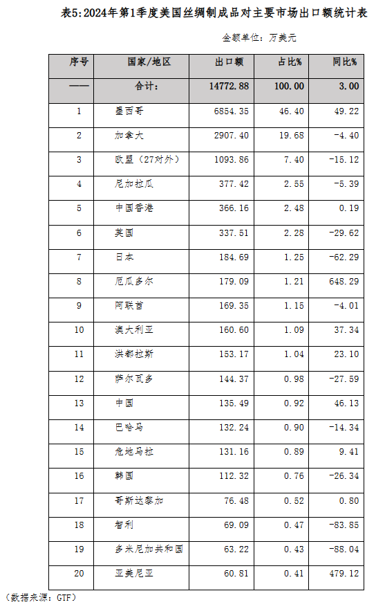 第1季度,美國絲綢制成品出口仍延續(xù)了近五年的增長態(tài)勢。墨西哥和加拿大是美國出口主要市場,合計占比已超過六成。其中,對墨西哥出口大幅49.22%(詳見表5)。