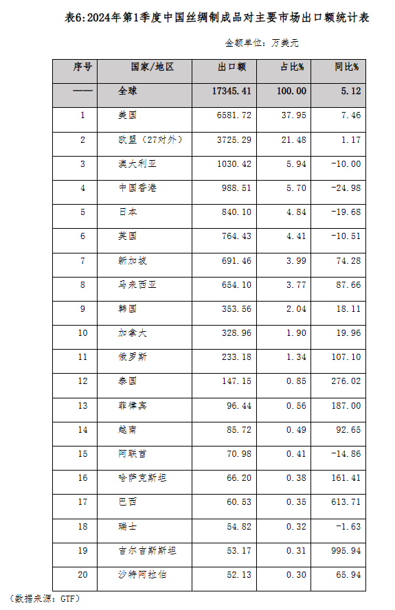 2024年第一季度中國絲綢制成品出口向好,是三大類中唯一出口增長的類別,增幅為5.12%。其中對最主要的歐美市場出口均出現(xiàn)增長。其中,對美出口增幅達7.46%。如需更多中國絲綢貿(mào)易情況,請登陸紡織商會網(wǎng)站(www.ccct.org.cn)至絲綢分會欄目查詢(詳見表6)。
