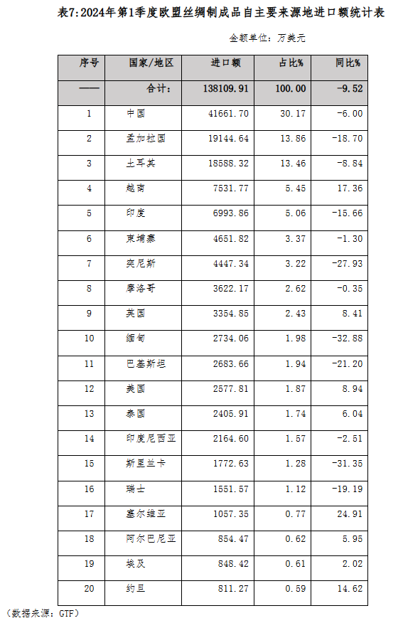 第1季度,歐盟絲綢制成品進口額持續(xù)下降,且降幅已擴大至9.52%。前五位主要來源中,除自越南進口增長外,自其他4大來源地進口均不同程度下降(詳見表7)。