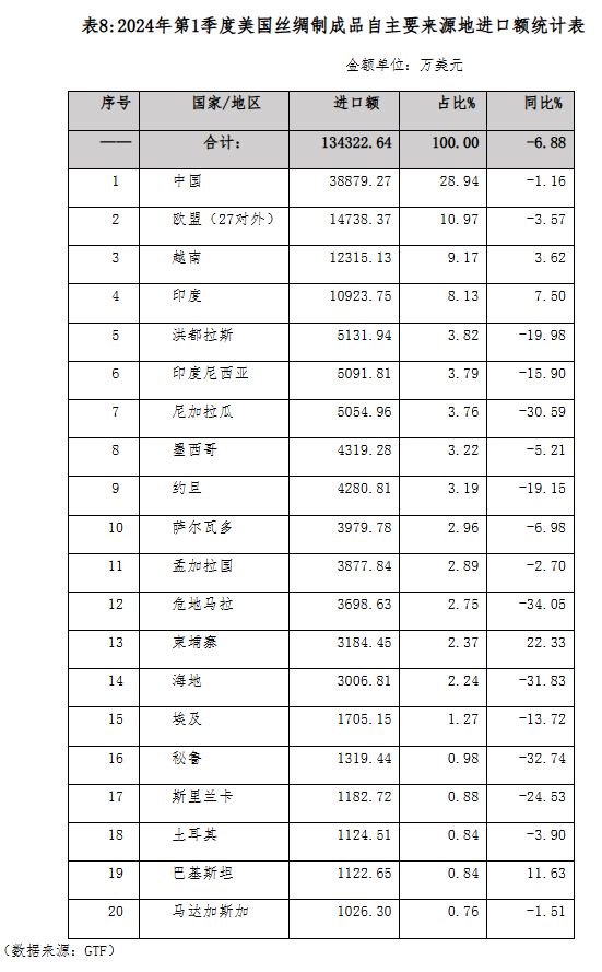 第1季度,美國絲綢制成品進口額降幅明顯收窄。主要進口來源中,除自越南和印度的進口出現(xiàn)小幅增長外,自其他來源地進口均下降。其中,自第一大進口來源中國的進口降幅大幅收窄至1.16%,所占份額持續(xù)下降(詳見表8)。