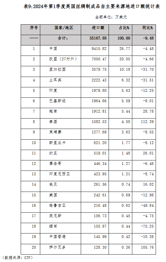 第1季度,英國絲綢制成品進口仍下降。自前五位來源地的進口額同比均下降。其中,進口額降幅最高的是孟加拉和土耳其,降幅都超過了30%。值得注意的是,自越南和泰國的進口增長迅速(詳見表9)。