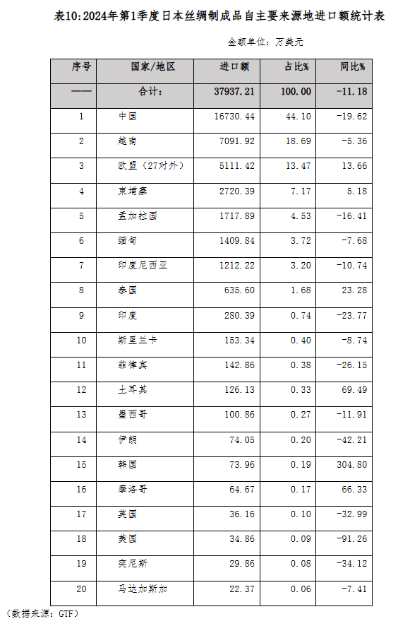 第1季度,日本絲綢制成品進口降幅進一步擴大。自主要來源地進口額漲跌互現(xiàn)。中國作為日本絲綢制成品第一大進口來源地,進口額同比降幅高達19.62%(詳見表10)。