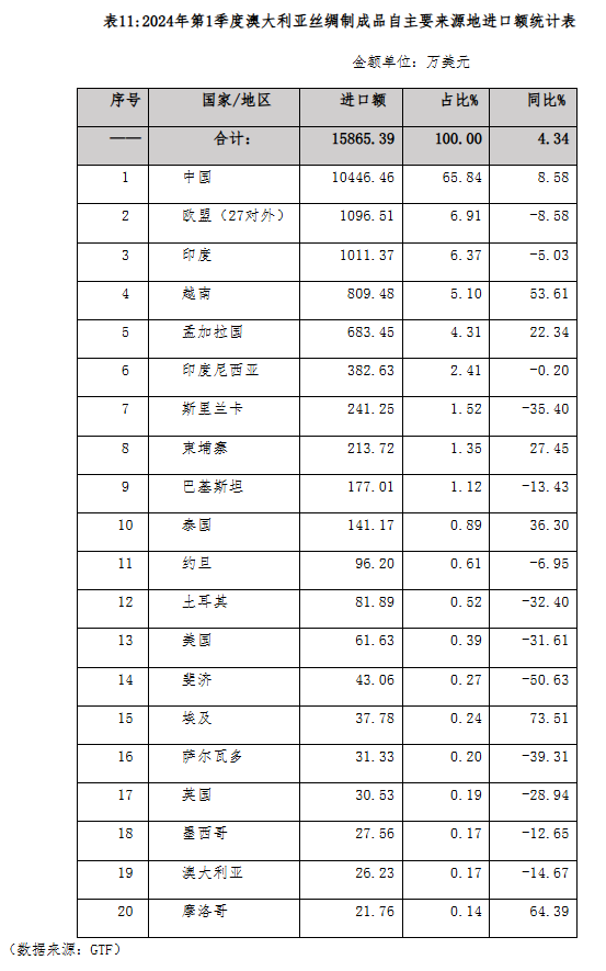 第1季度,澳大利亞絲綢制成品自中國進口的快速增長帶動整體進口轉(zhuǎn)跌為升。其它主要來源地中,自孟加拉和越南進口增長較快,但自歐盟和印度進口下降(詳見表11)。