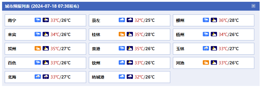 19日白天到晚上,桂南有陣雨或雷雨、局地大雨到暴雨,桂北多云有分散陣雨、局地中到大雨。最高氣溫:桂東33~36℃,桂西29~33℃。